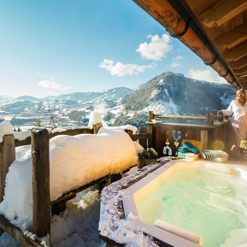 In our Chalets you can enjoy the woody warmth of our cosy Alpine Cabin combined with the quiet elegance of an exclusive resort. Relaxation starts when waking up in an infinity bed, that melts together with the mountains in your courtyard. Everyday life immediately retreats into far distance. To the furnishing belong your own SPA area and your private outdoor whirlpool as well as the fully equipped rustic kitchen with its wine refrigerator. After a good meal you are invited to enjoy the beautiful view. Your fireplace is well-stocked with enough wood to spend long evenings in front of it.