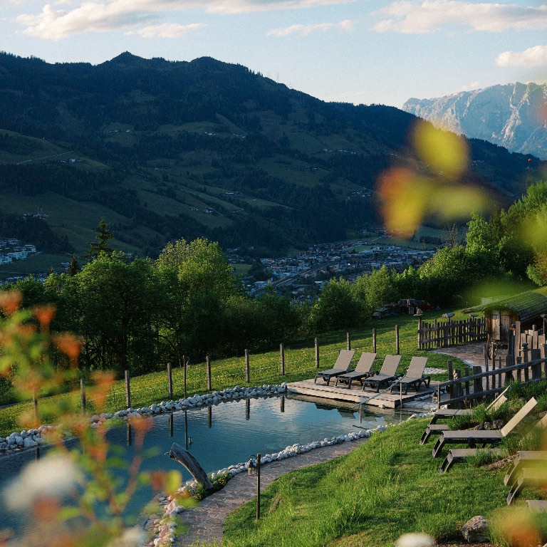 The unique natural swimming lake at the BERGHERZ chalet village is a dream for families and groups.